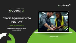 Ecoeuro organizza un corso di formazione PES PAV per addetti alla gestione dei veicoli elettrici ed ibridi, nelle giornate del 29 e 30 gennaio 2026 (il primo giorno in presenza il secondo giorno on line) e un corso di aggiornamento PES PAV (solo on line) il giorno 4 febbraio 2026.