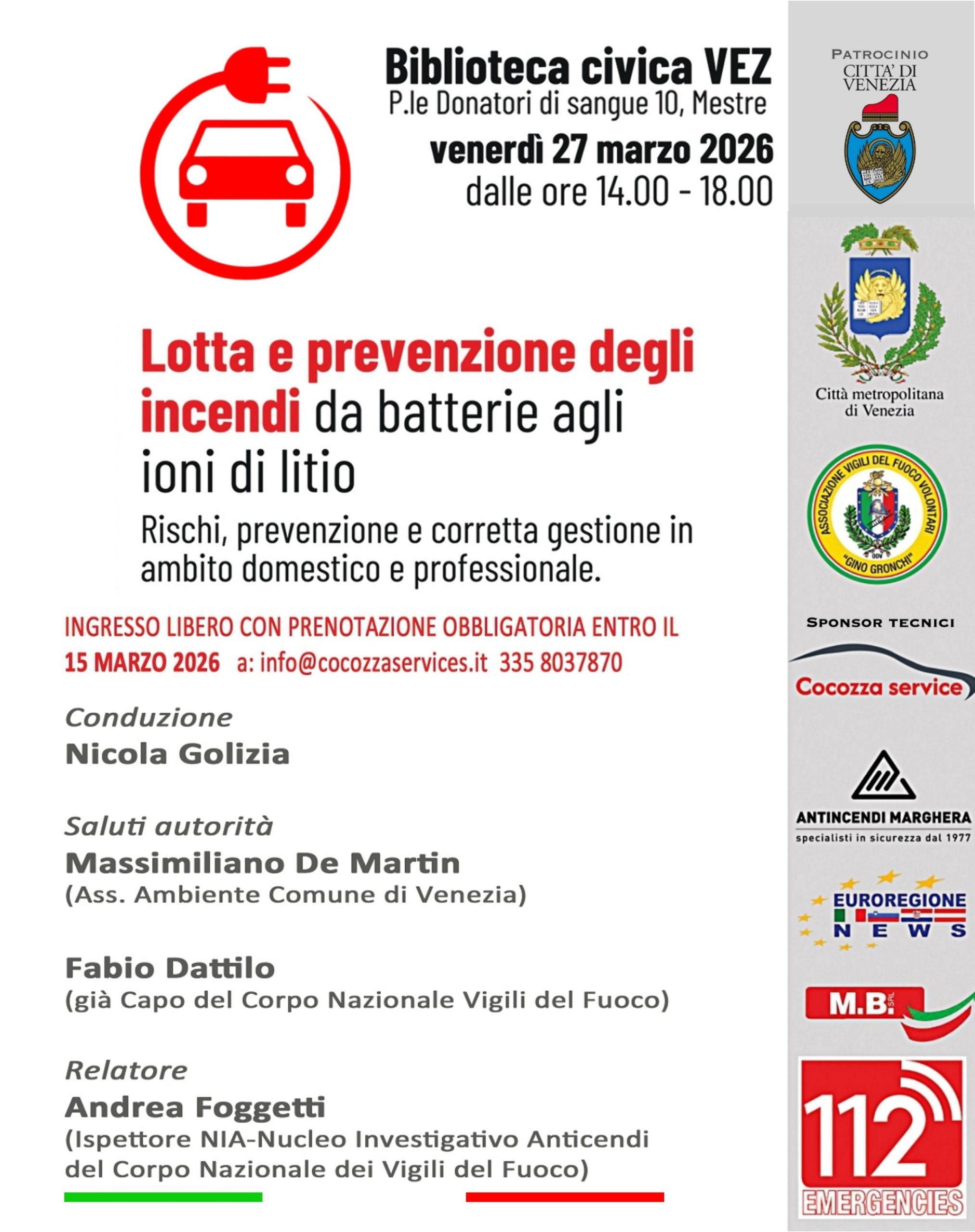 Il prossimo 27 marzo 2026 dalle ore 14,00 alle ore 18,00 presso la Biblioteca civica VEZ a Mestre (Ve) – Piazzale Donatori di sangue, 10 si terrà un evento divulgativo sulla conoscenza, gestione e prevenzione degli incendi delle batterie agli ioni di litio. L’evento, organizzato dalla Cocozza service srl ha ottenuto il patrocinio della Città di Venezia ed è realizzato anche con la collaborazione del Comando Provinciale dei Vigili del Fuoco.